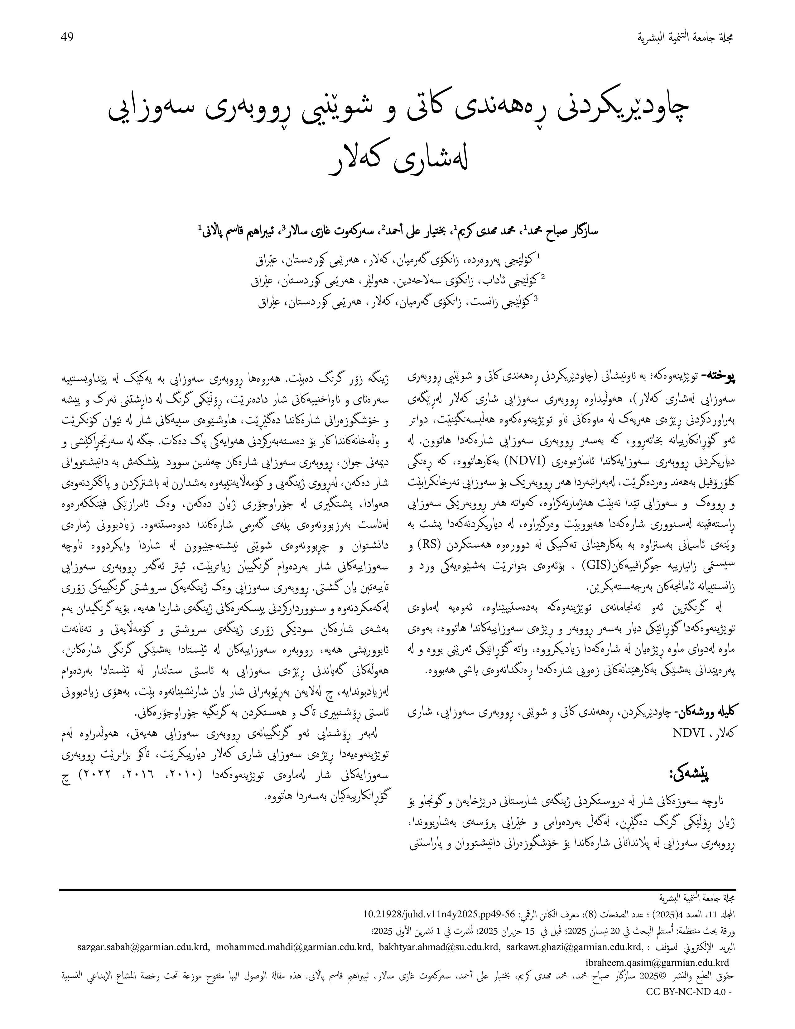 Green Spaces, NDVI, Monitoring, Spatio-Temporal Dimensions, Kalar CityAbstract